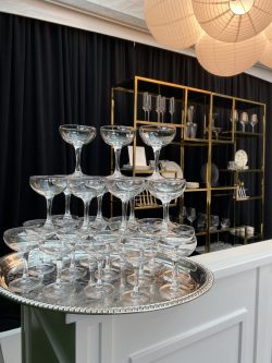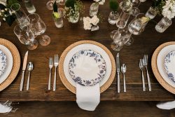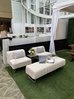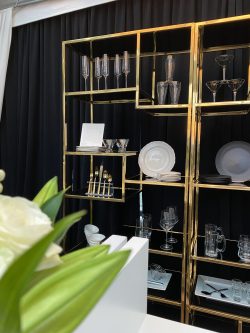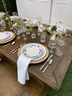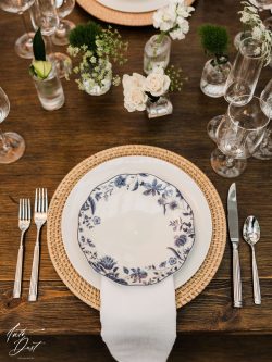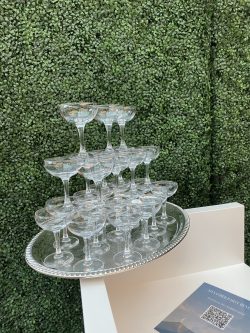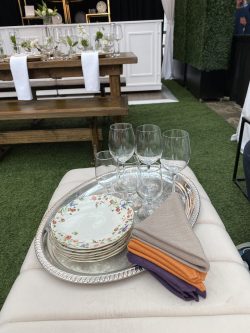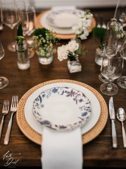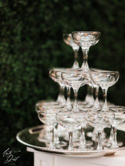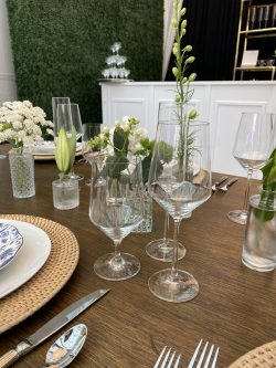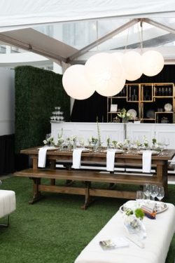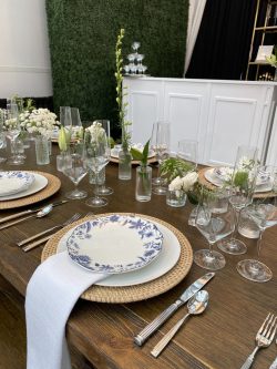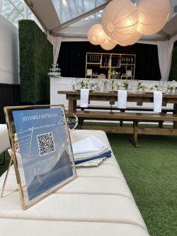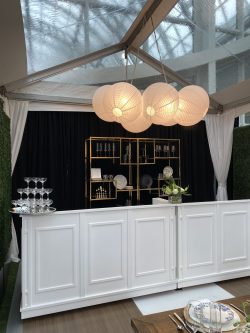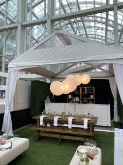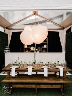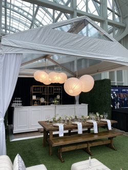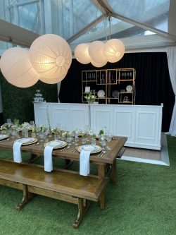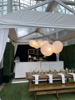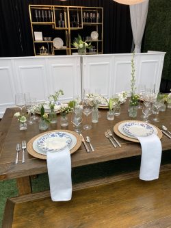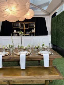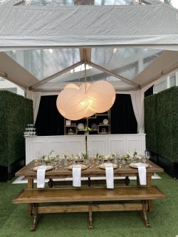 10×20 Clear Tent with White Trim, Tent Leg Drapes, Hedge Walls, Sodo Bar, Gold Barback, Lantern with Drop Pendant Lights, White Dance Floor, Vineyard Table, Louis Back Rattan Chairs, Honey Rattan Charger Plates, Coupe Dinner Plates, Ashleigh Salad Plates, White & Gold Hampton Flatware Set, Pure White Wine Glasses, Pure Long Drink Glasses, Pure Whiskey Glasses, and Panama Tangerine Napkins.