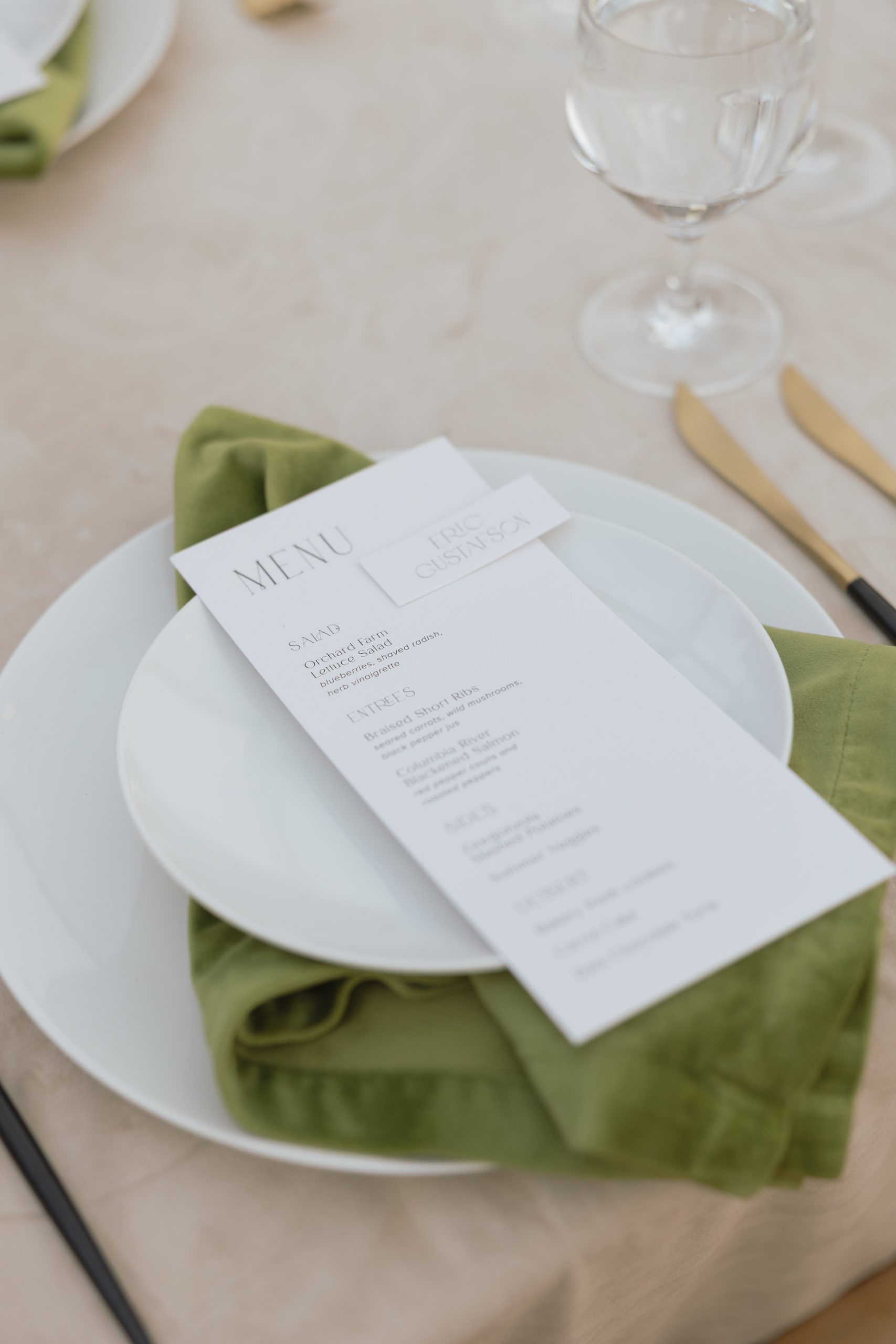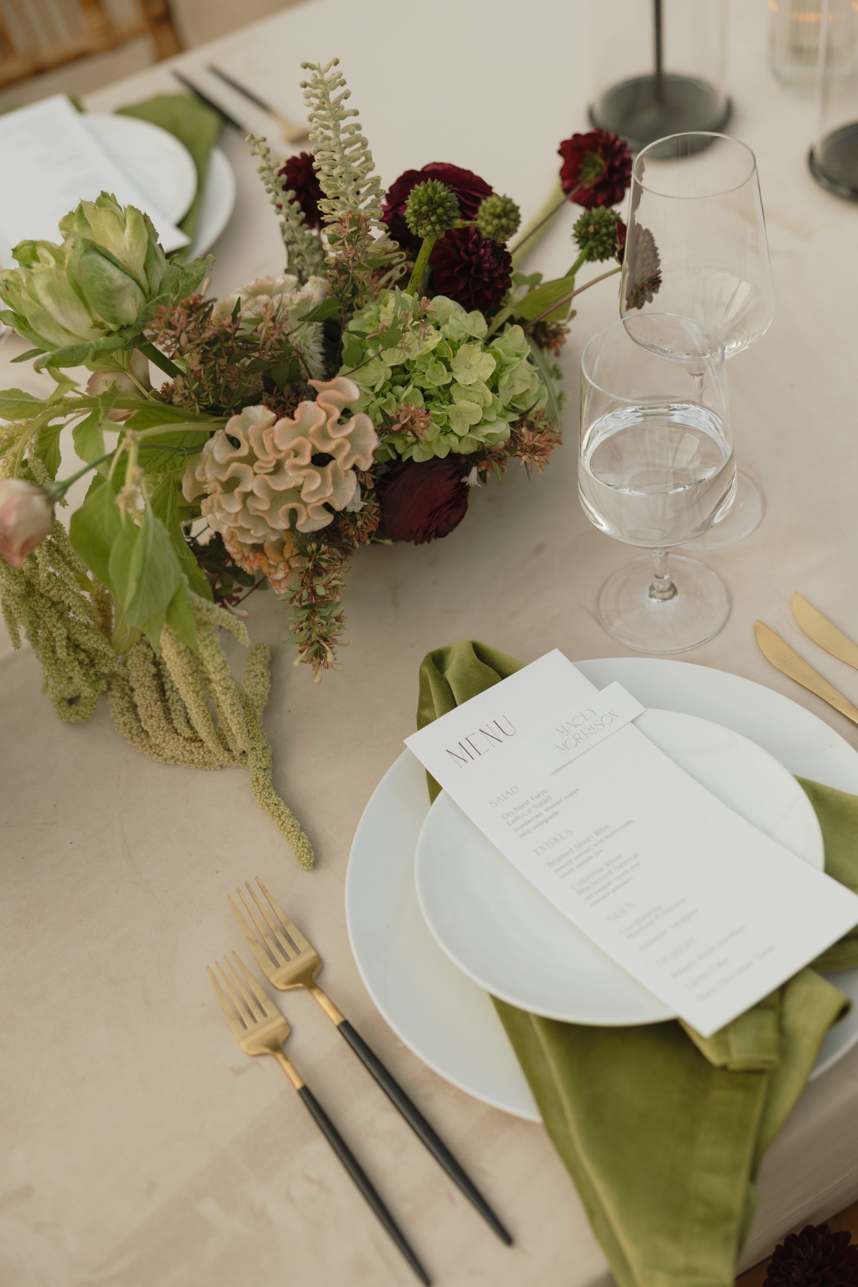 Dining & Tabletop: The tables were set with our sleek Coupe Dinnerware and Pure Glassware. To add a modern, luxurious edge, we featured the Hampton Gold and Black Flatware, which popped beautifully against the neutral linens.
