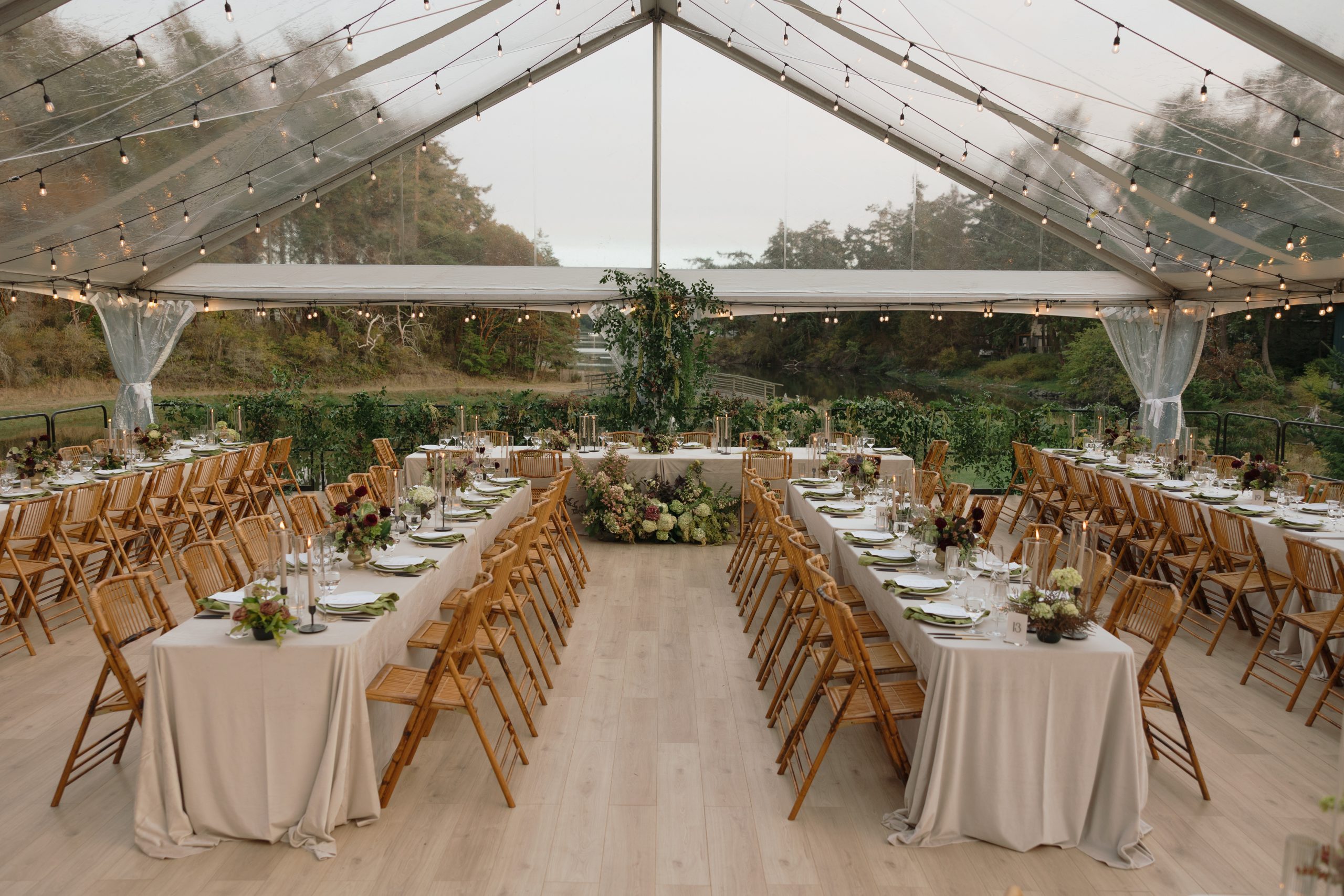 Tenting & Structure: We installed a massive 40×60 Clear Gable Canopy and a 20×30 Clear Gable Canopy, allowing guests to enjoy the forest views while staying protected. To ensure the evening remained cozy as the sun dipped, our Propane Tent Heaters provided a subtle, consistent warmth.