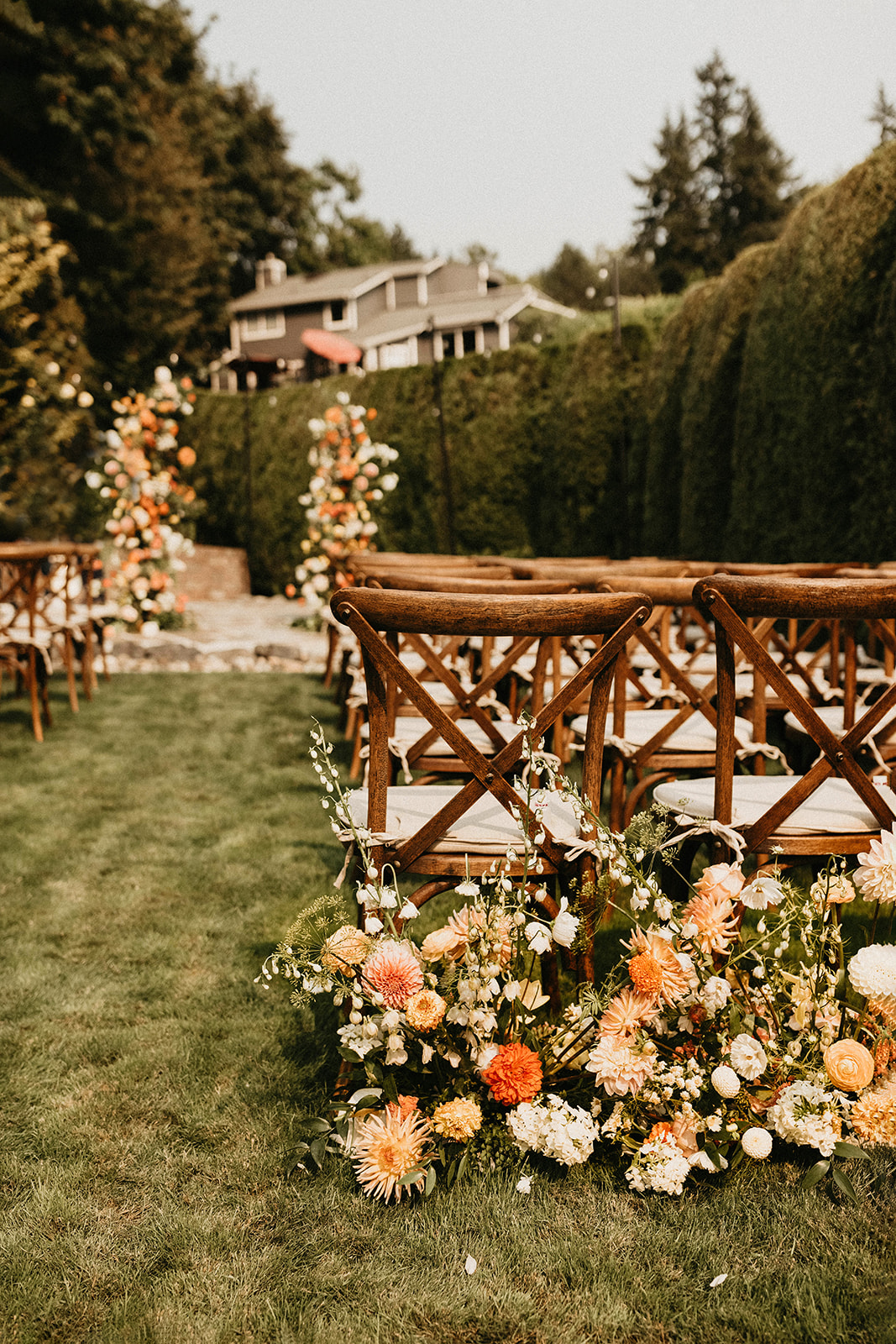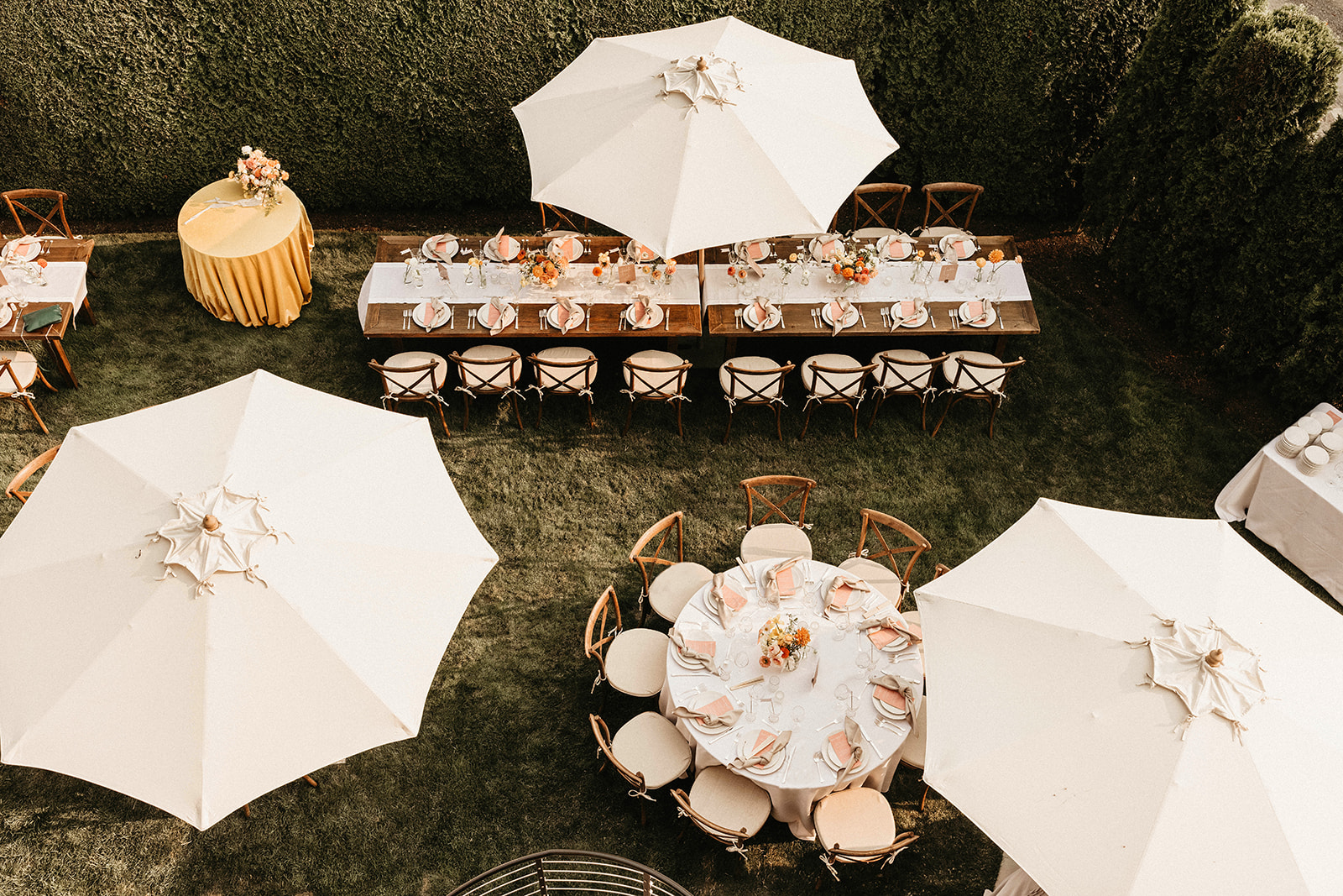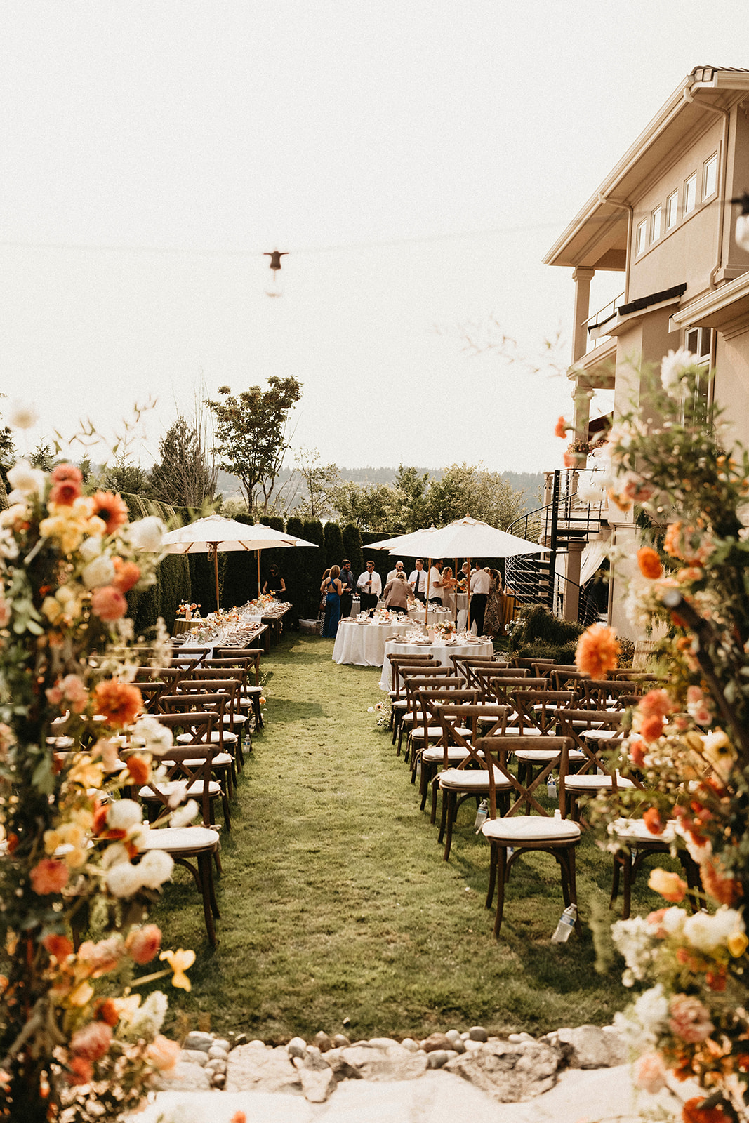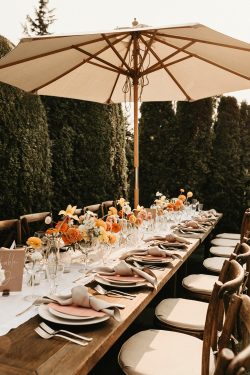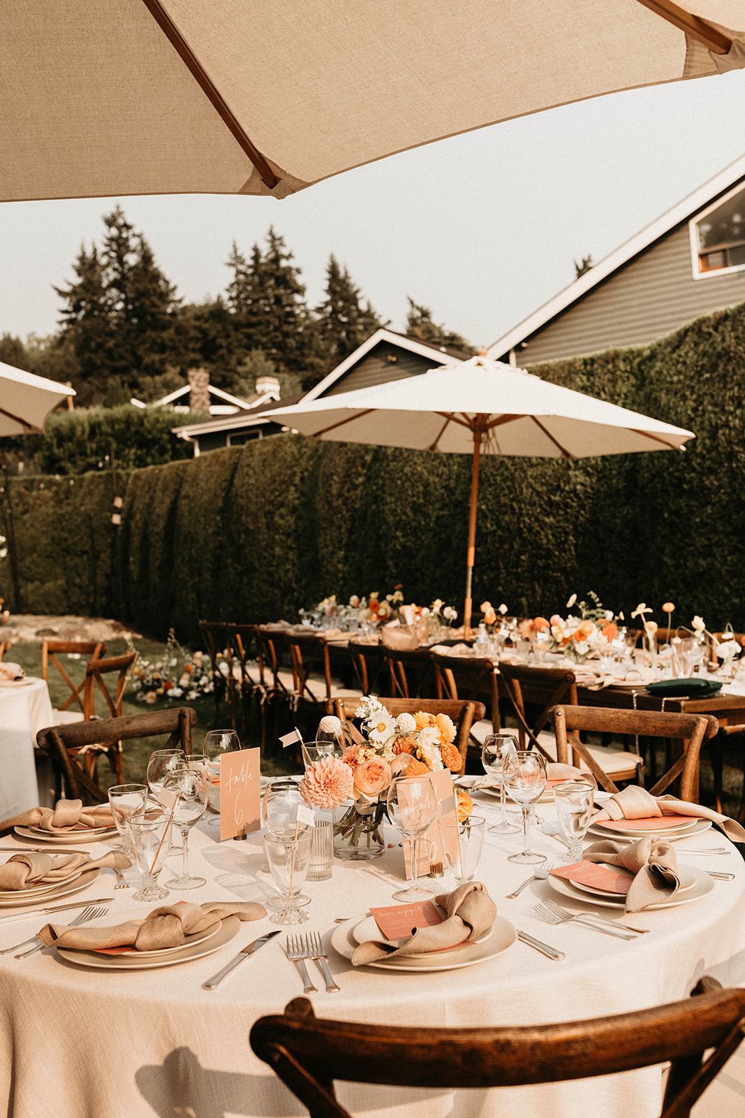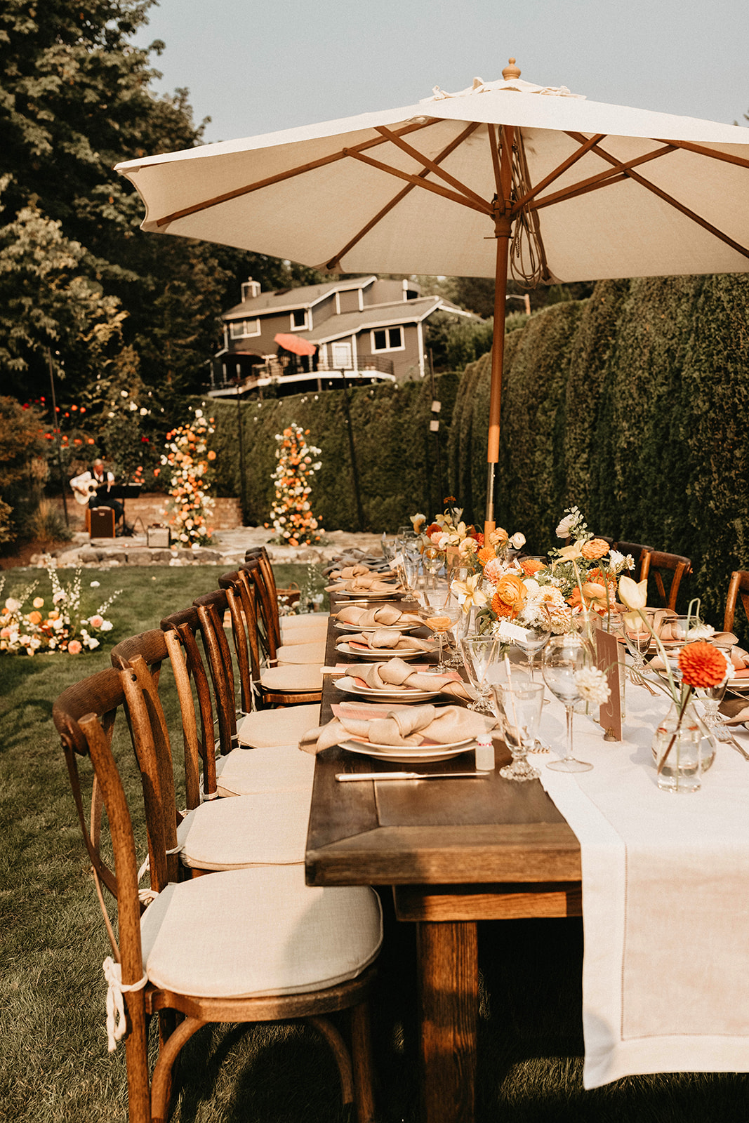 Imagine a late-summer day in the Pacific Northwest, bathed in a soft, golden light. This was the breathtaking setting for Bayley and Ryan’s backyard garden wedding, a testament to romance and natural beauty. The intimate venue was transformed into an elegant, sun-drenched sanctuary. Rows of our Vineyard Oakwood chairs lined the aisle, leading to stunning floral arches in warm terracotta, peach, and cream. The reception seamlessly blended rustic charm with refined style, featuring long, wood-top tables under the dappled shade of market umbrellas. Every detail, from the vibrant centerpieces to the carefully set place settings, contributed to a genuinely memorable and deeply personal celebration. The whole atmosphere felt warm, joyous, and utterly sophisticated.