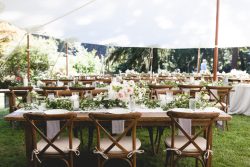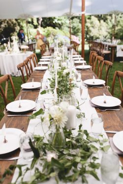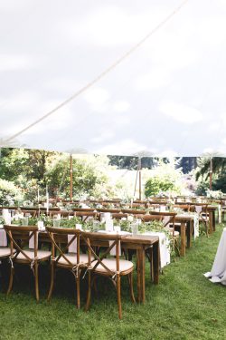 17 Vineyard 8’x40″ Farm Tables: These rich, wood-toned tables provided a sturdy, communal feel that grounded the airy tent environment.