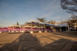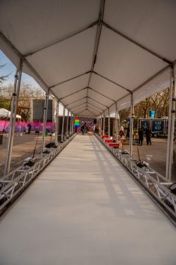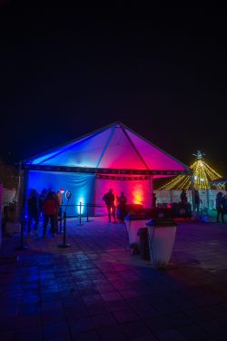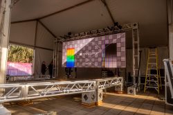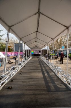 10×80 tent, 30×30 tent, 15×15 bandshell tent, 10×10 tents, banner frameworks, and stanchions.